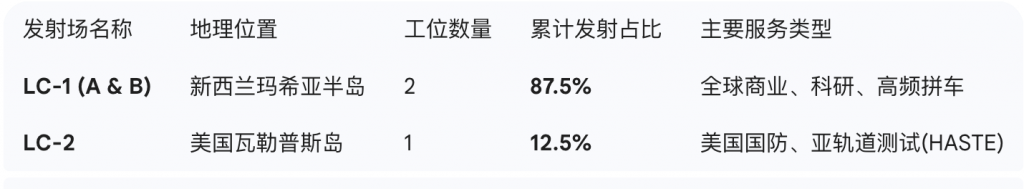火箭实验室目前拥有3个火箭发射台: 新西兰(LC1,2个发射位),美国弗吉尼亚州(LC2,1个发射位),美国弗吉尼亚州(LC3,1个发射位,中子发射)。
