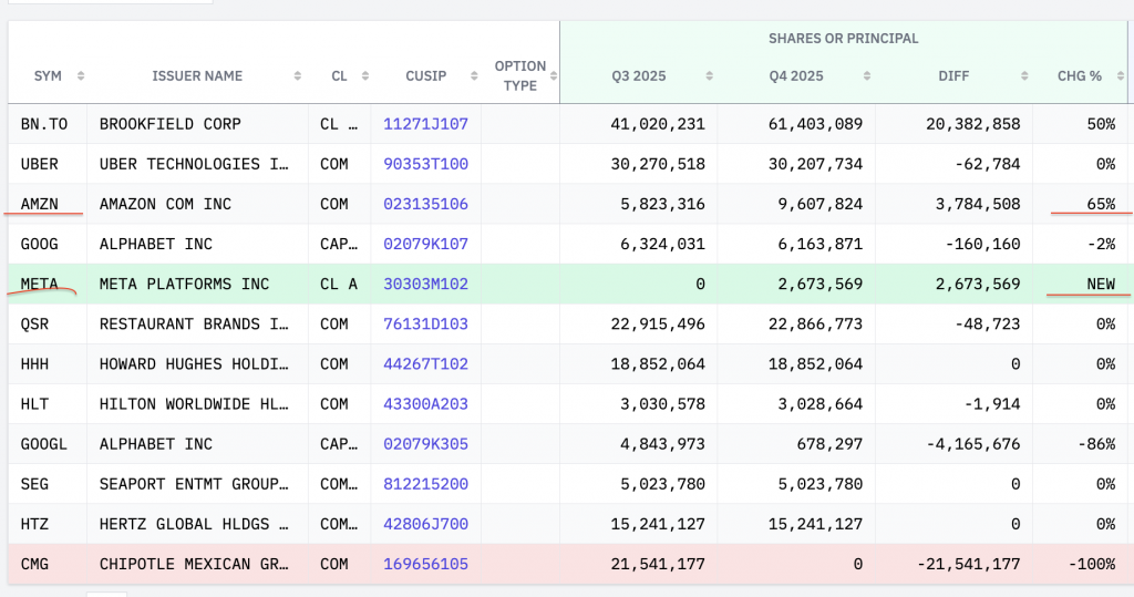 如今,来到了2026年2月份,看Bill Ackman最新持仓变化: